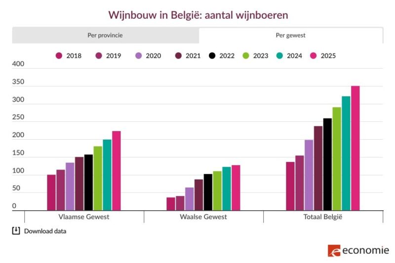 Ook het aantal wijnbouwers neemt verder toe. In 2025 telt België 350 wijnbouwers, tegenover 321 in 2024 en 290 in 2023.